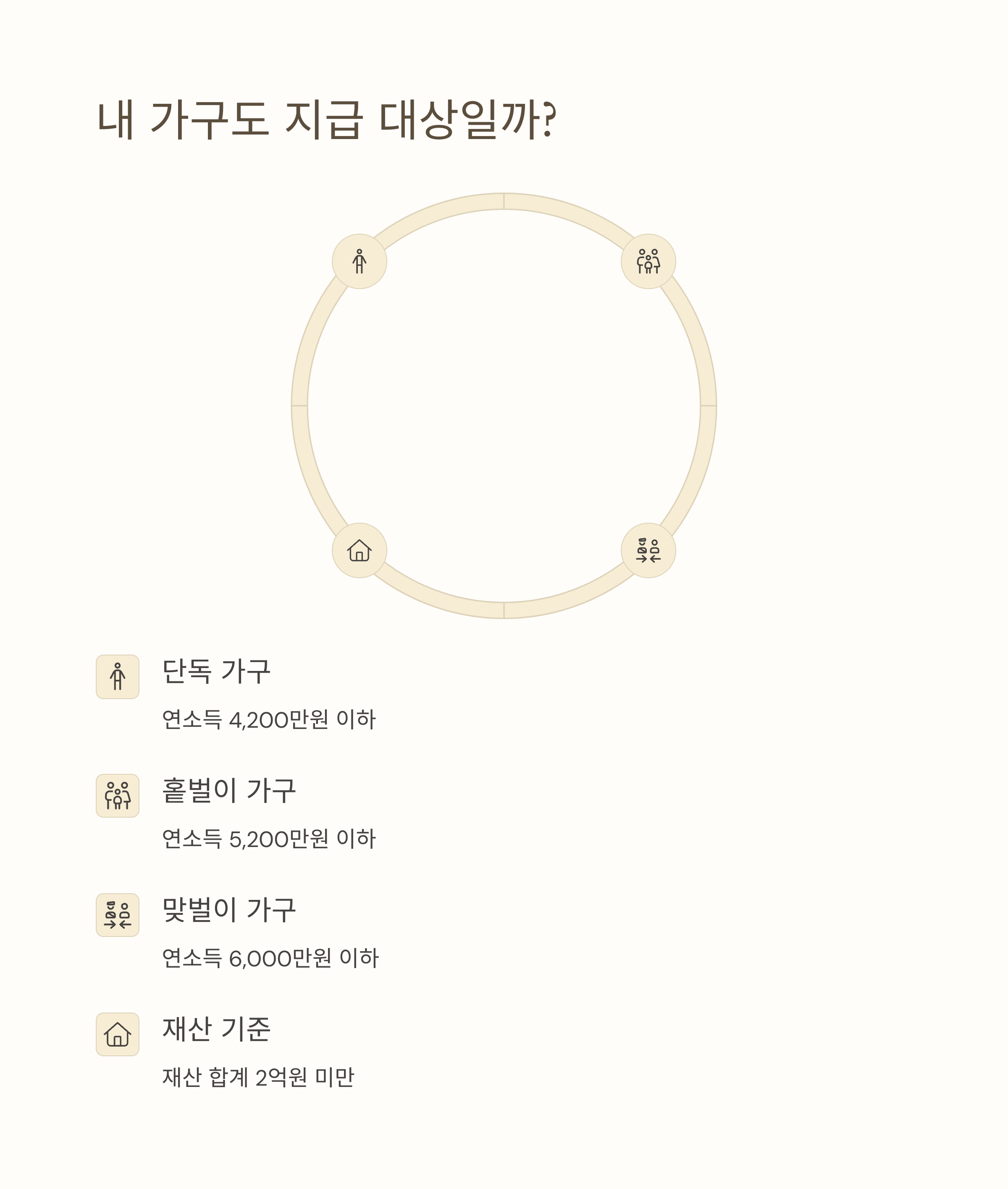 지급 대상은 가구 단위로 결정되며, 단독 가구, 홑벌이 가구, 맞벌이 가구로 구분됩니다.