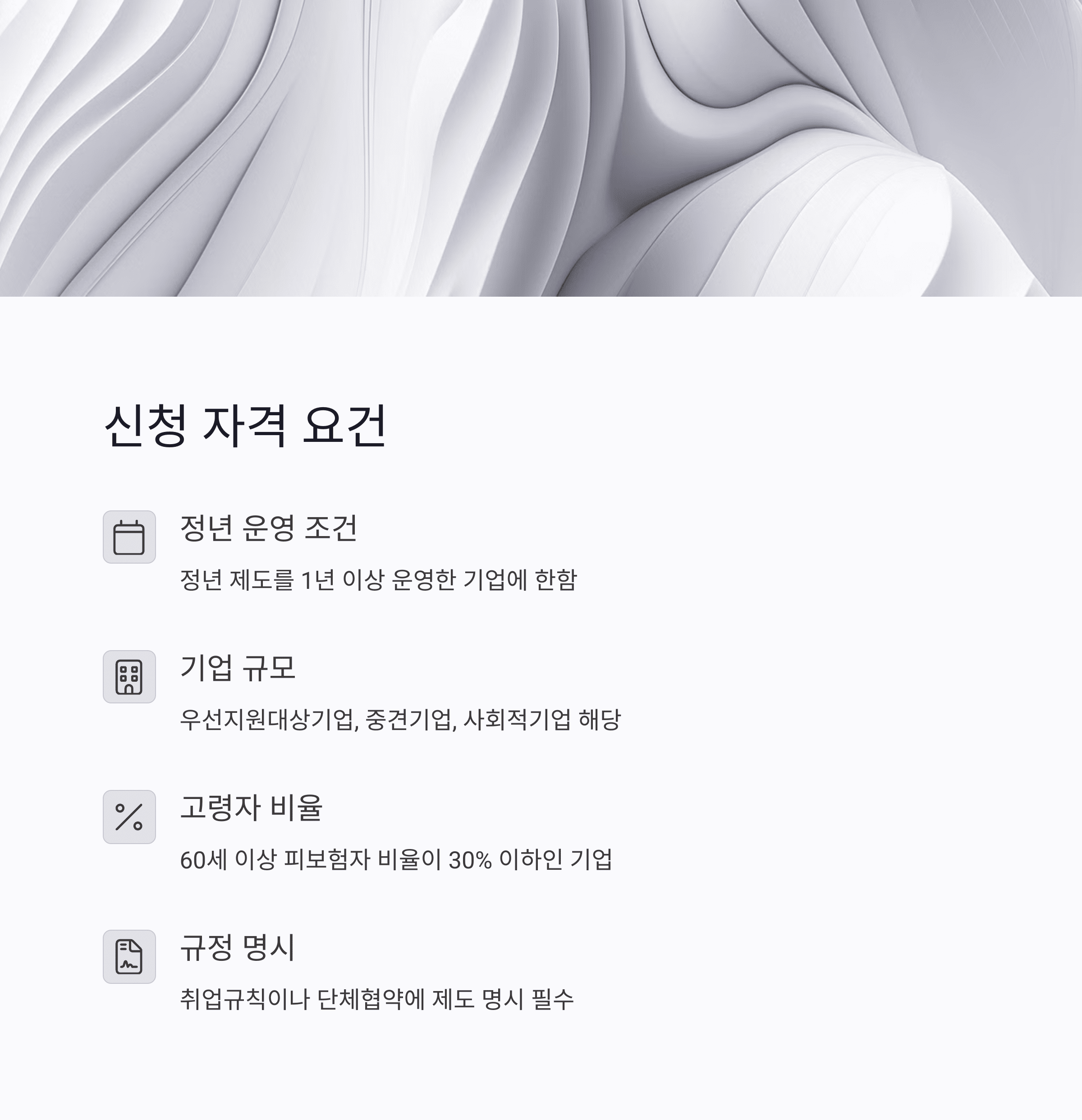 - 취업규칙 또는 단체협약에 정년연장, 정년폐지, 재고용 제도를 명시해야 합니다.