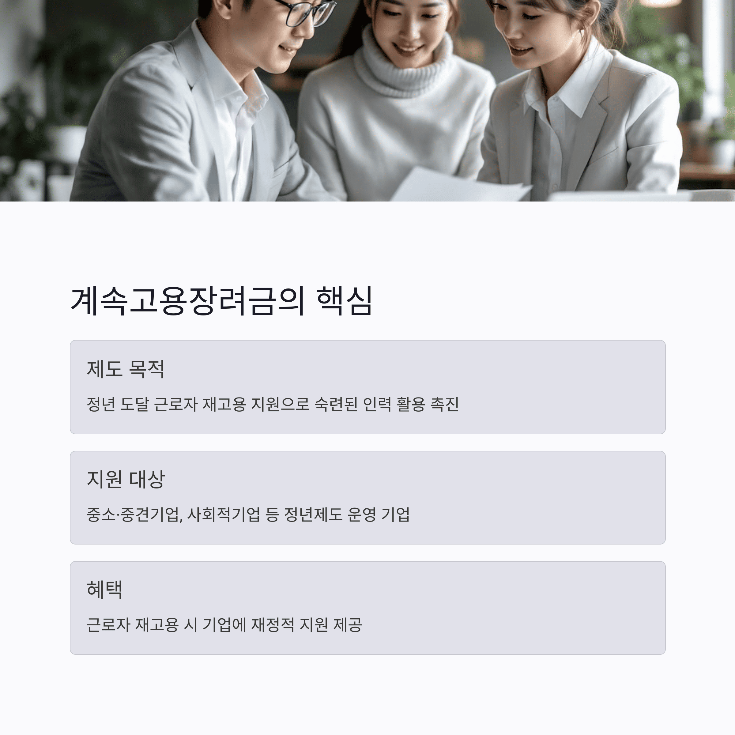 (썸네일 이미지 첨부: '고령자 계속고용장려금 신청방법' 관련 심플하고 따뜻한 톤)