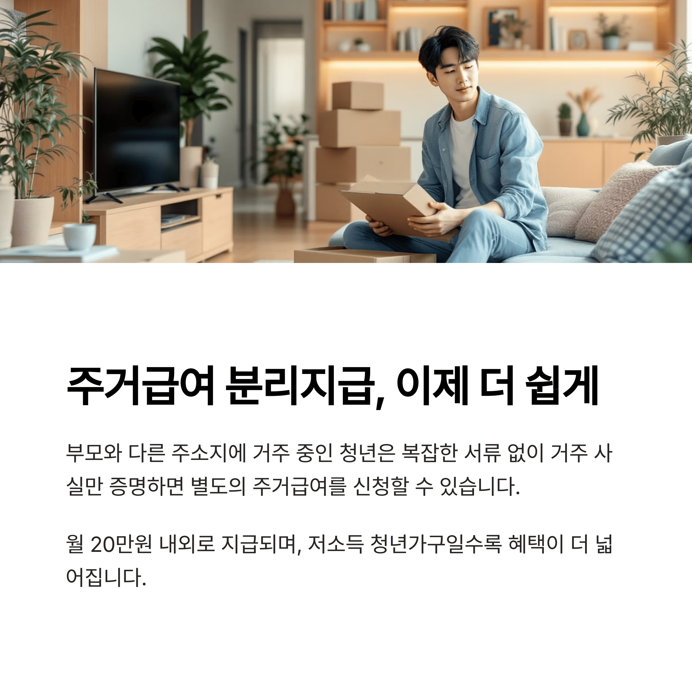 | 월세 사는 20대 청년 | 청년 월세 지원금, 주거급여 분리지급 |