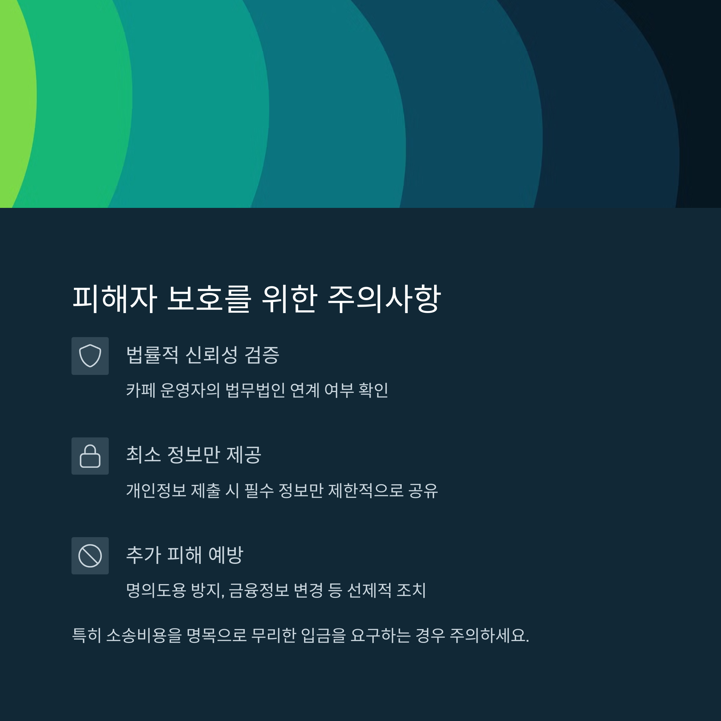 "반드시 카페 운영자의 신뢰도(법무법인 연계 여부)를 꼼꼼히 확인하세요."
