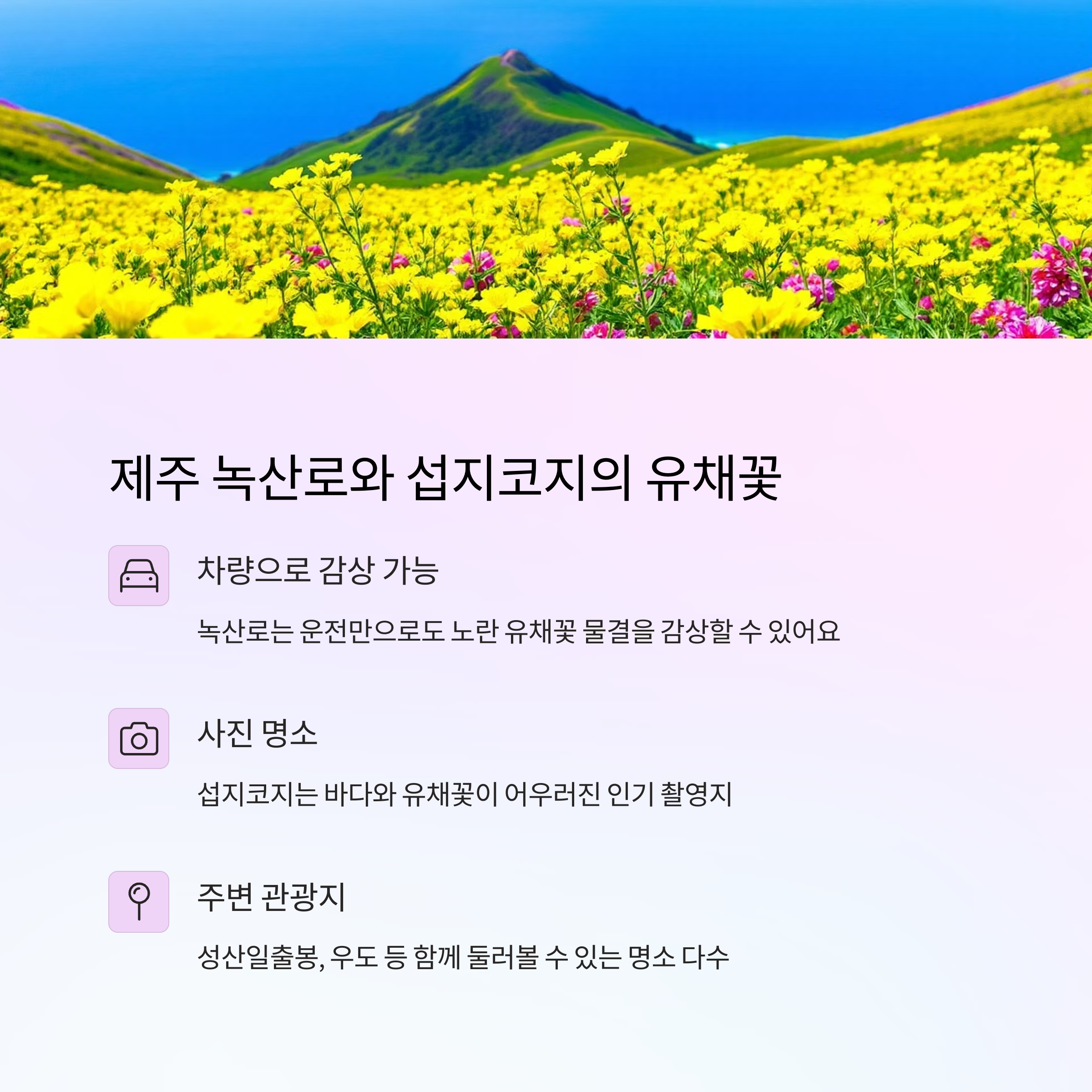 - 섭지코지는 바닷가와 유채꽃이 어우러진 명소로, 사진 촬영지로도 유명