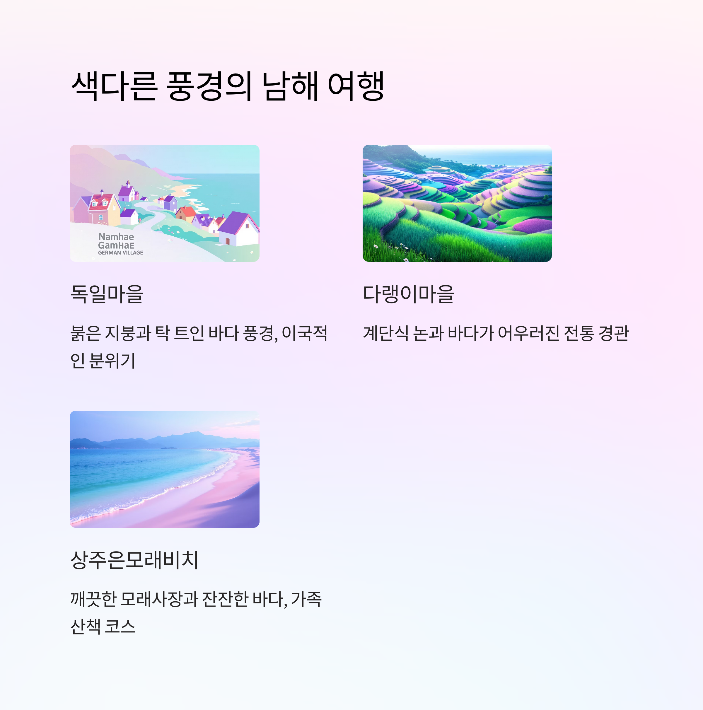 경남 남해는 유럽풍 마을과 해안 풍경이 어우러진 특별한 여행지입니다.