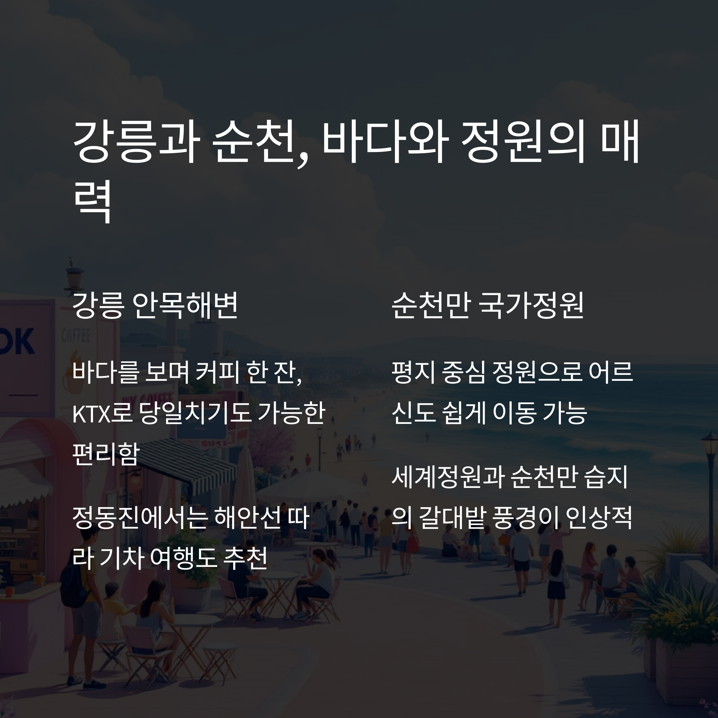 강릉은 교통도 편리하여 KTX로 서울에서 당일치기도 가능해요.