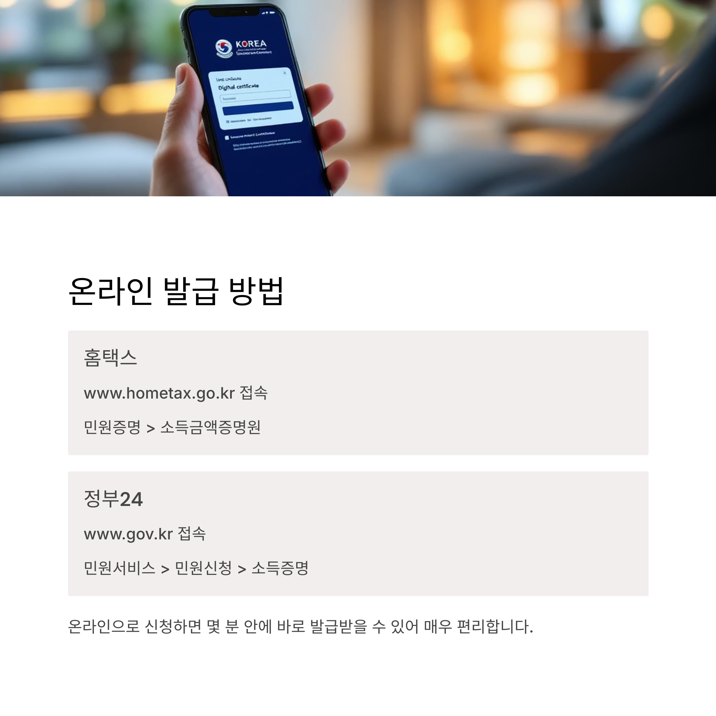 | 발급 경로 | 민원증명 > 소득금액증명원 | 민원서비스 > 민원신청 > 소득증명 |