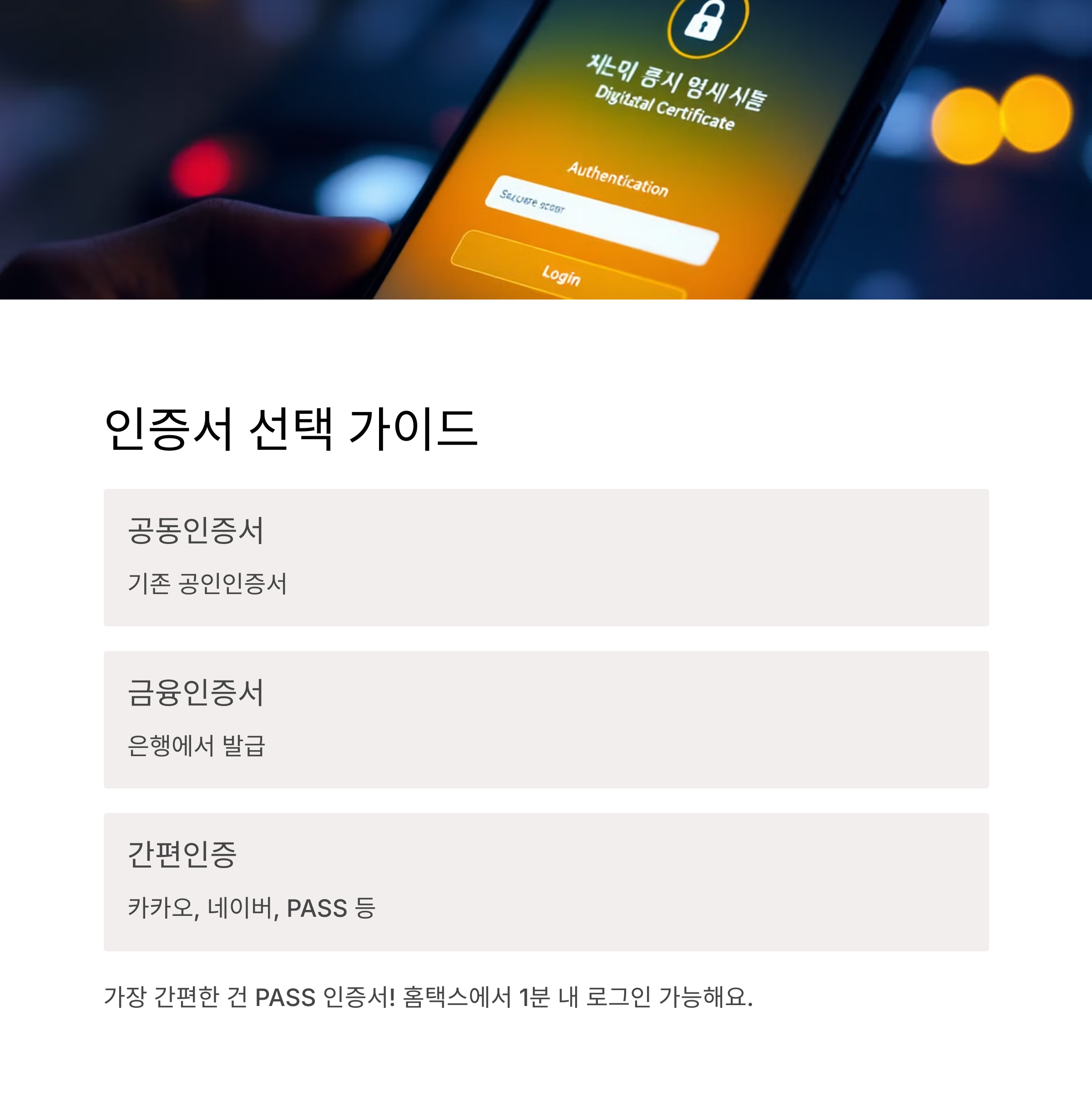 "가장 간편한 건 PASS 인증서! 홈택스에서 1분 내 로그인 가능해요."