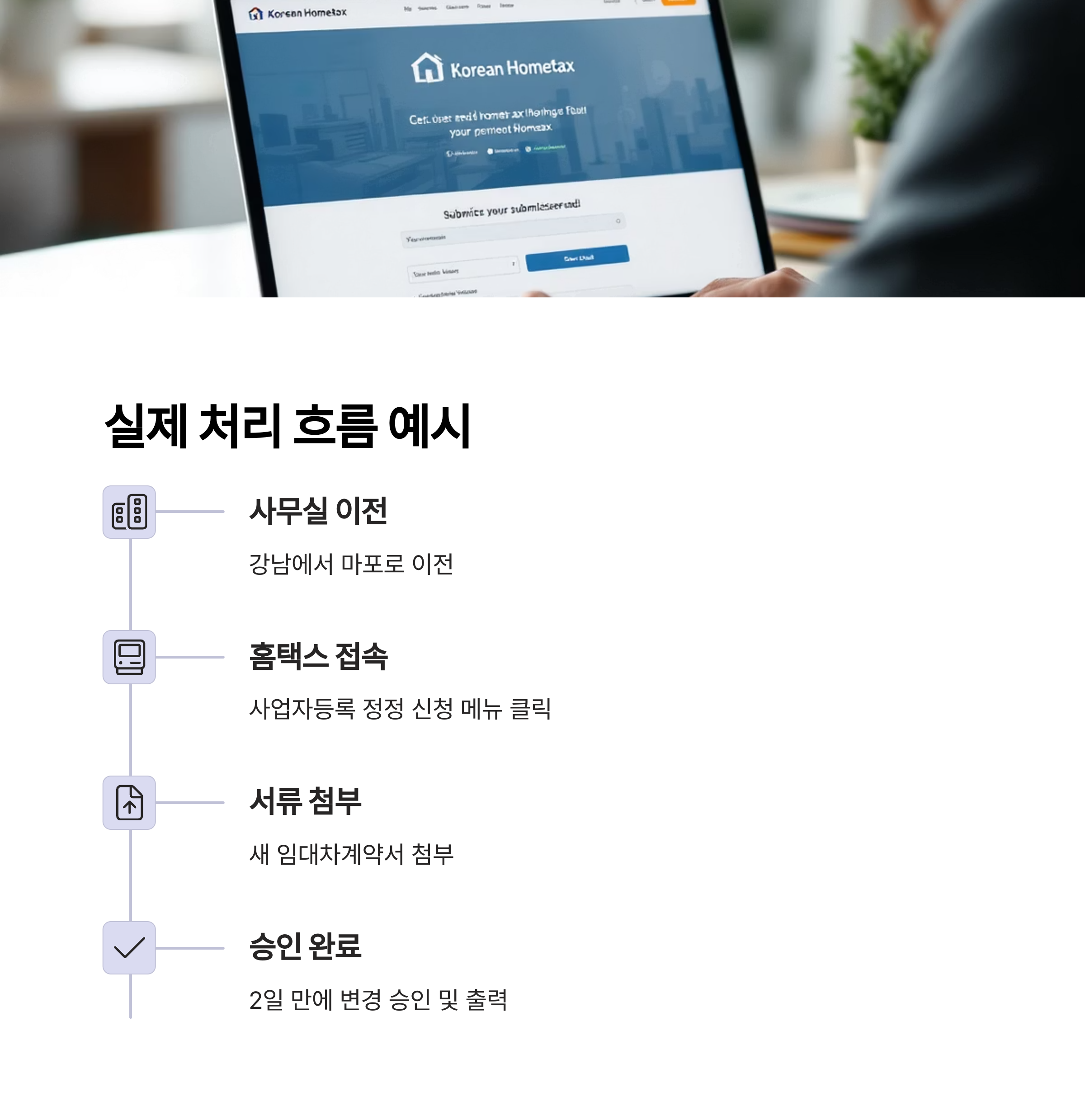 다만 법인사업자의 경우 등기부등본의 변경을 선행해야 하며, 지연 신고 시 과태료가 부과될 수 있으므로 주의가 필요합니다.
