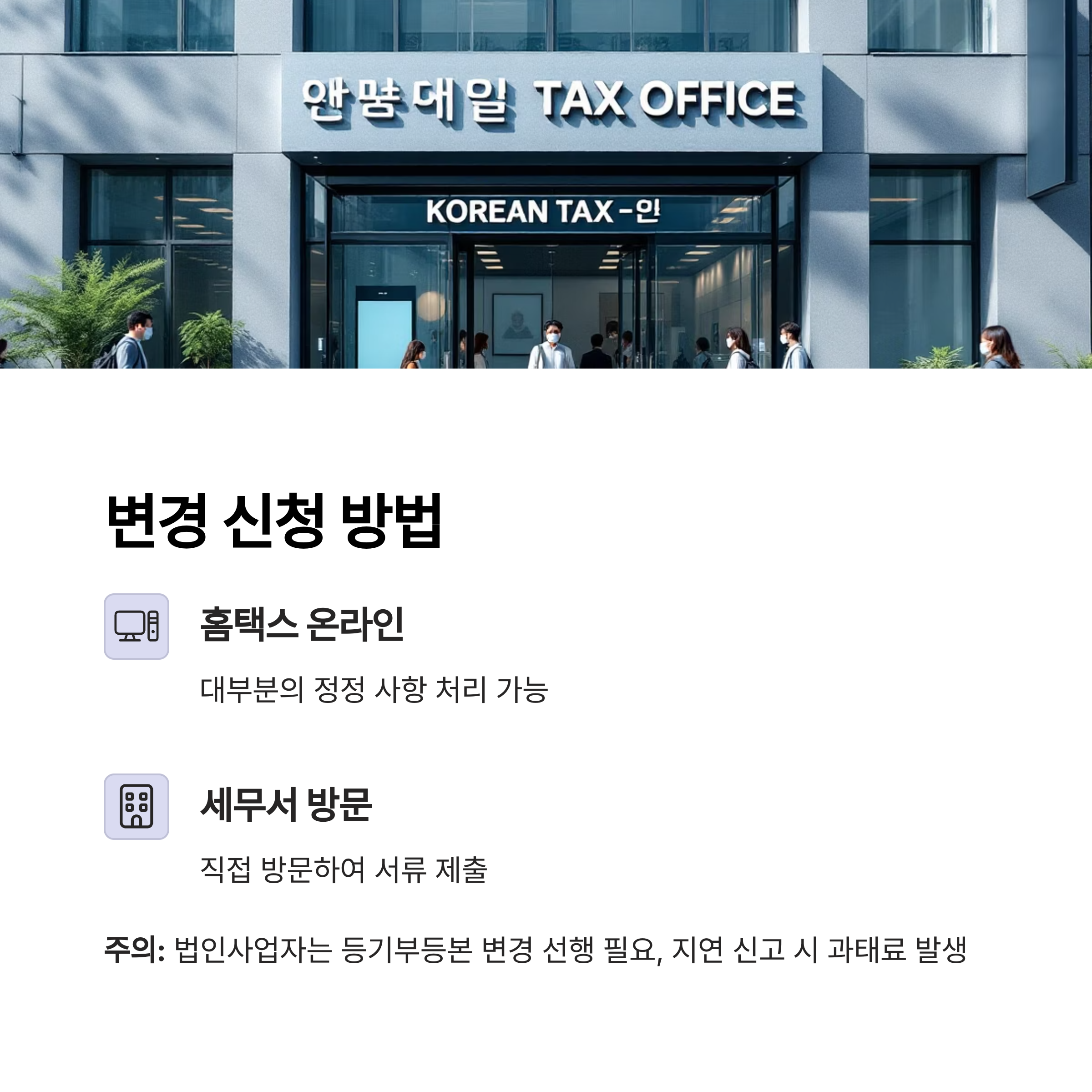 관할 세무서에 방문해 변경을 신청할 경우, 다음과 같은 절차가 필요합니다.