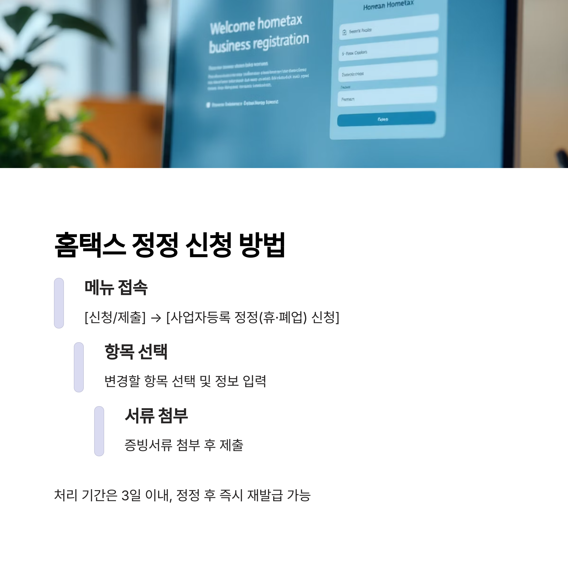 홈택스에서는 온라인으로 간편하게 신청할 수 있으며, 대표자 변경, 주소 변경, 업종 추가 등 대부분의 정정 사항을 처리할 수 있습니다.