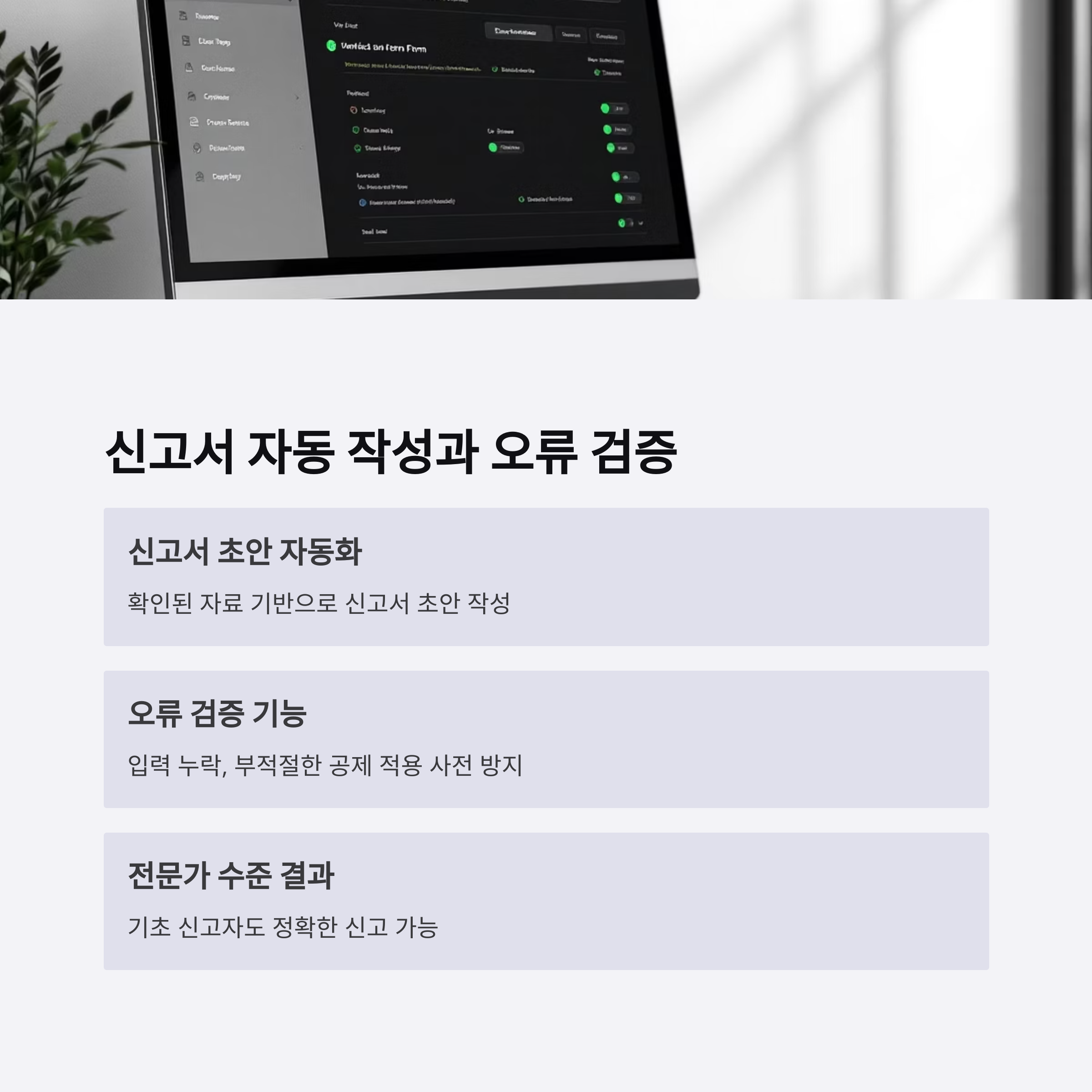 이후 자동 오류 검증 기능을 통해 입력 누락, 부적절한 공제 적용 등의 실수도 사전 방지할 수 있습니다.
