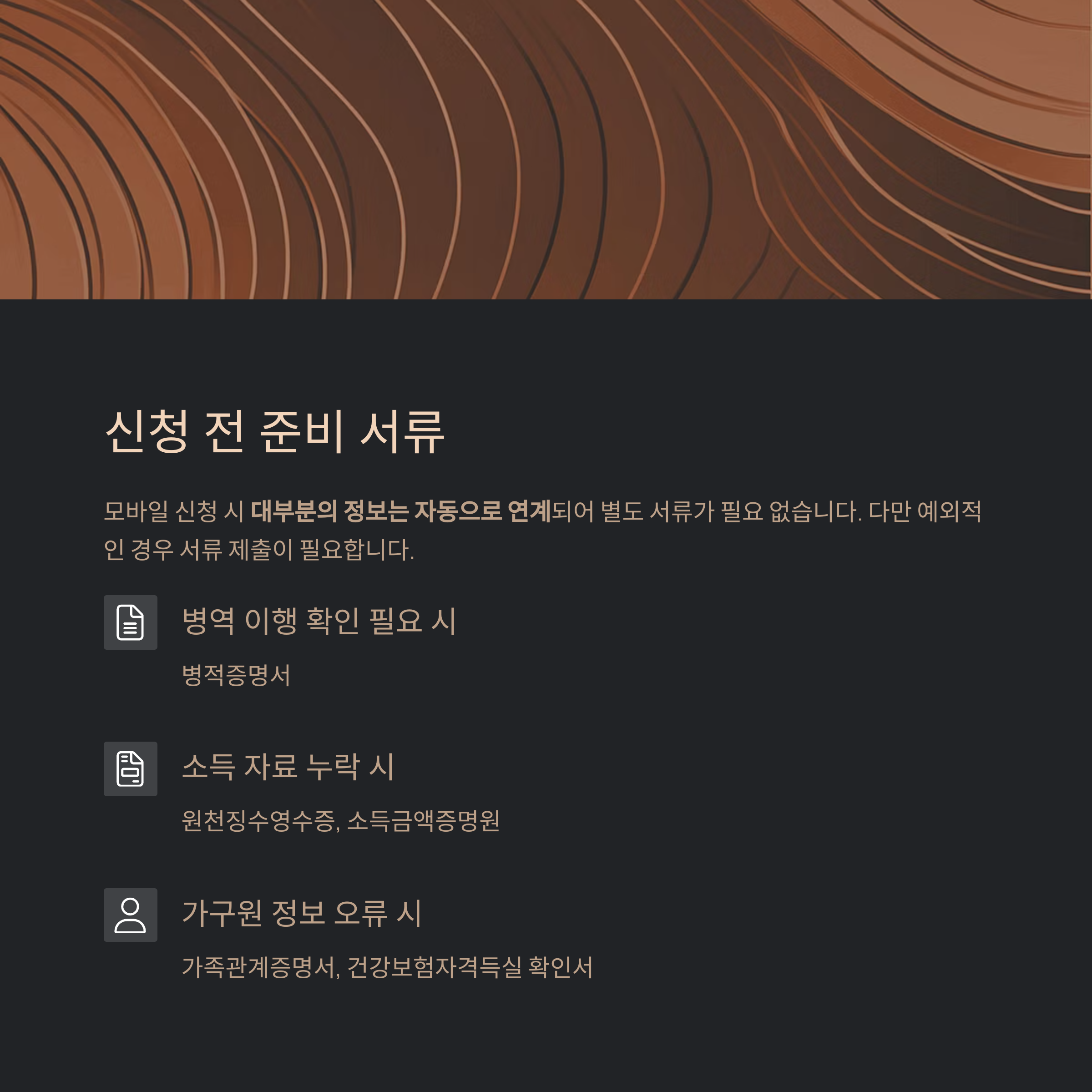 모바일 신청의 경우 대부분의 정보는 자동으로 연계되어 서류가 필요 없습니다.