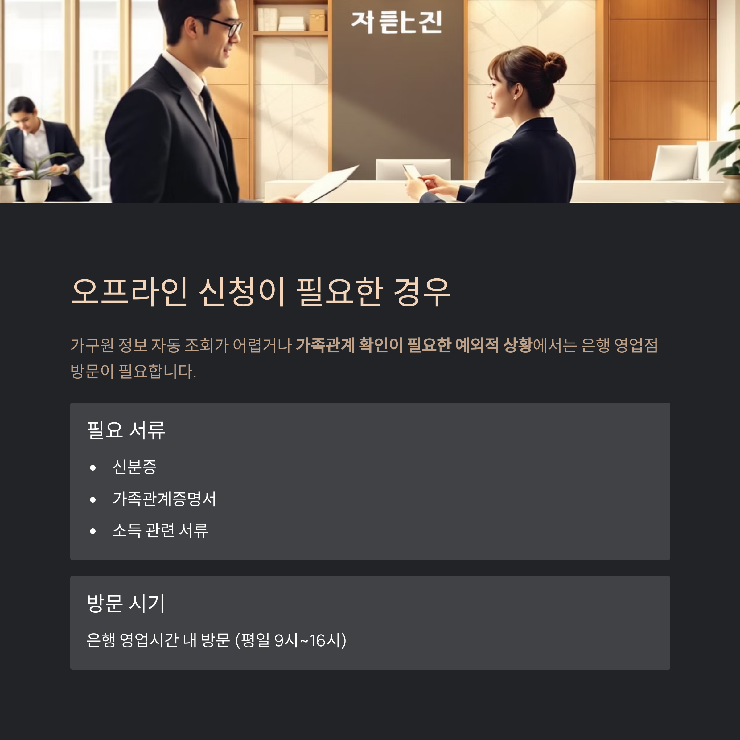 또는 가족관계 확인이 필요한 예외적 상황에서는 해당 은행 영업점을 직접 방문하여 신청할 수 있습니다.