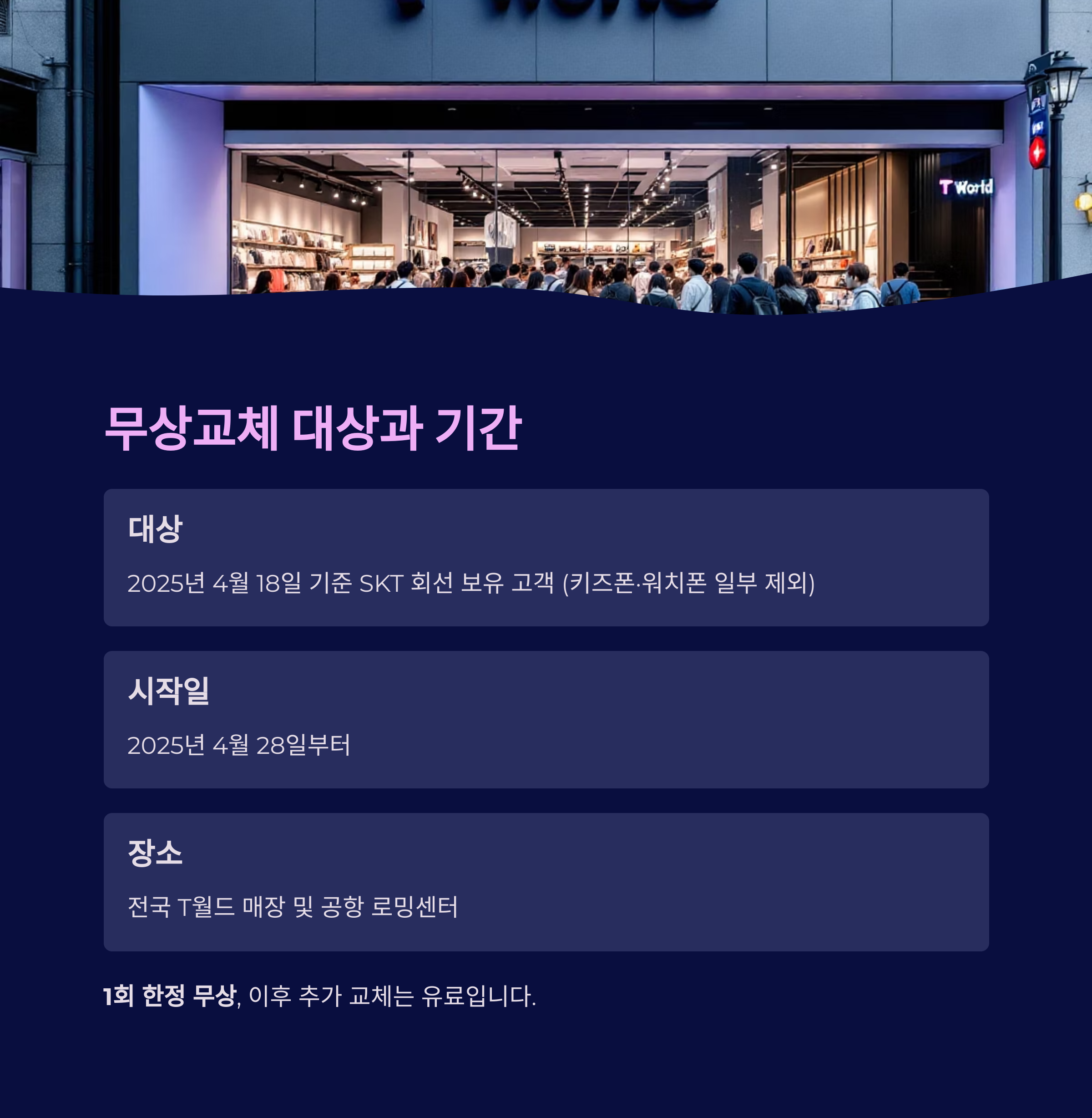 2025년 4월 28일부터 전국 모든 T월드 매장 및 공항 로밍센터에서 무상교체가 시행 중입니다.