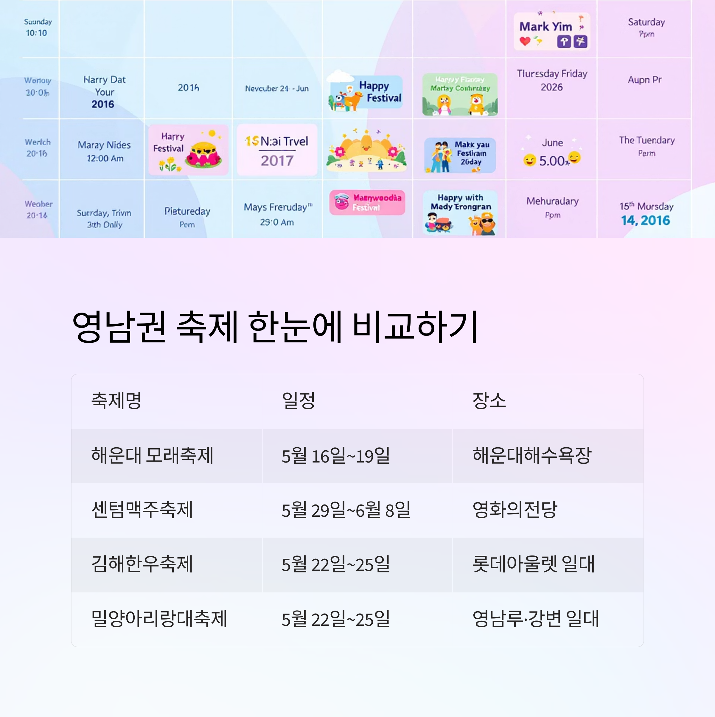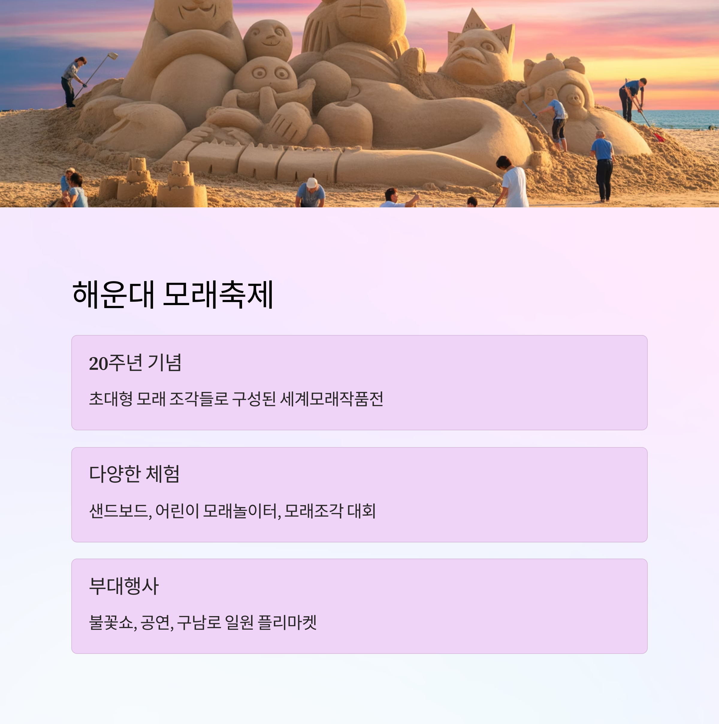 | 해운대 모래축제 | 5월 16일 ~ 5월 19일 | 해운대해수욕장, 구남로 광장 | 모래조각전, 샌드보드, 불꽃쇼, 체험, 플리마켓, 공연 |