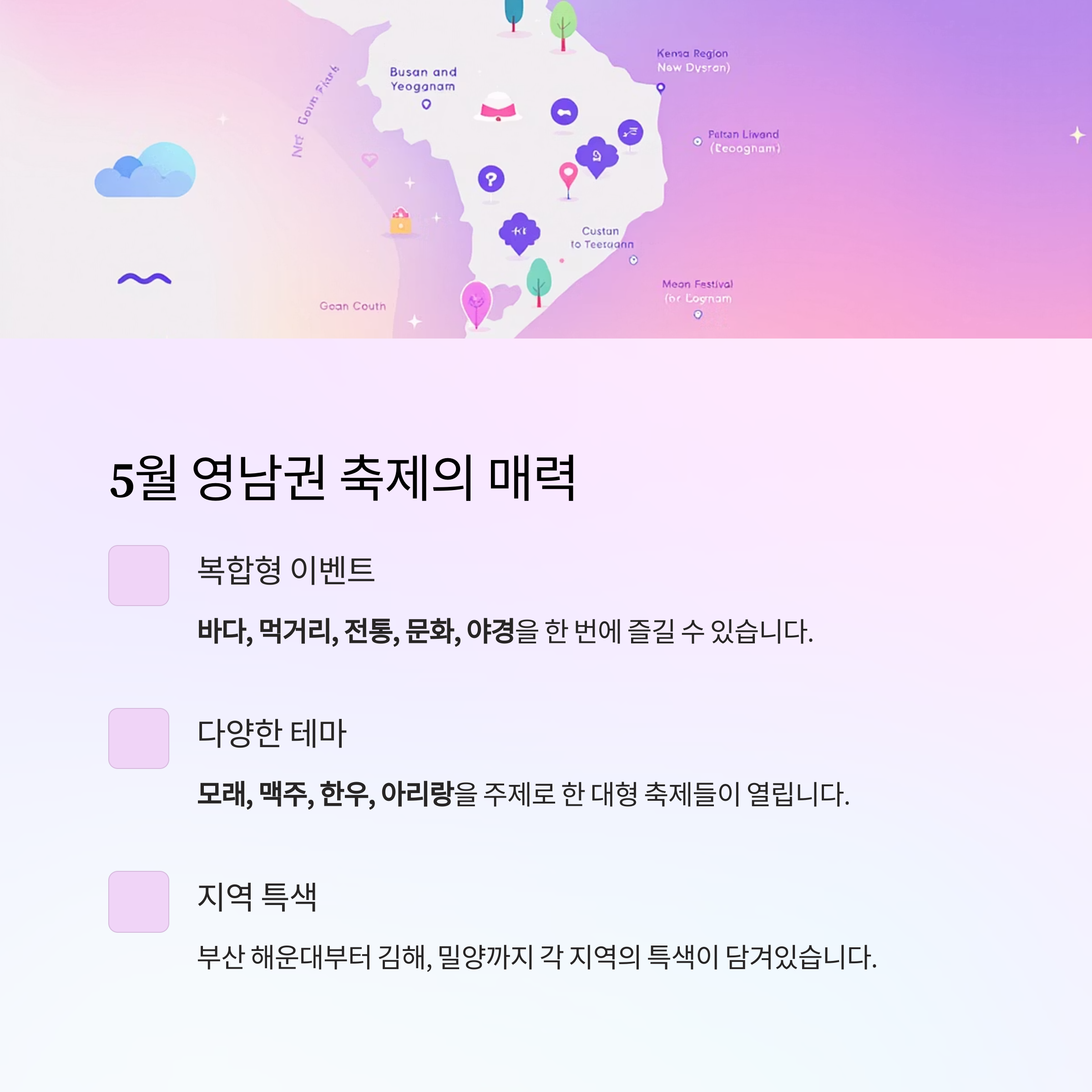 5월 부산·경남권은 축제 여행지로 완벽한 시기입니다. 테마에 맞춰 즐겨보세요.