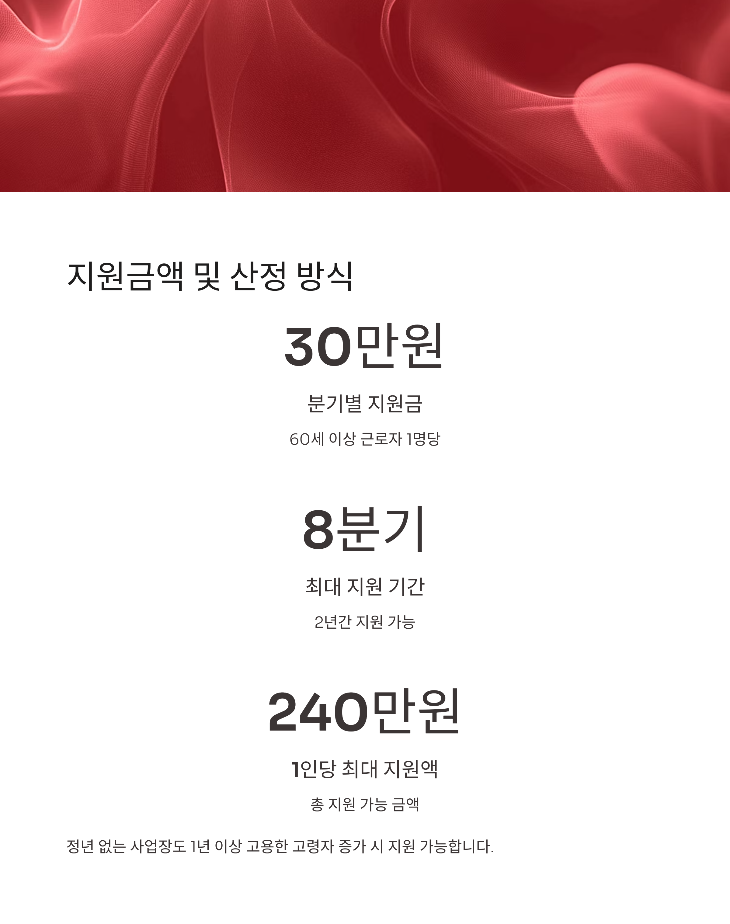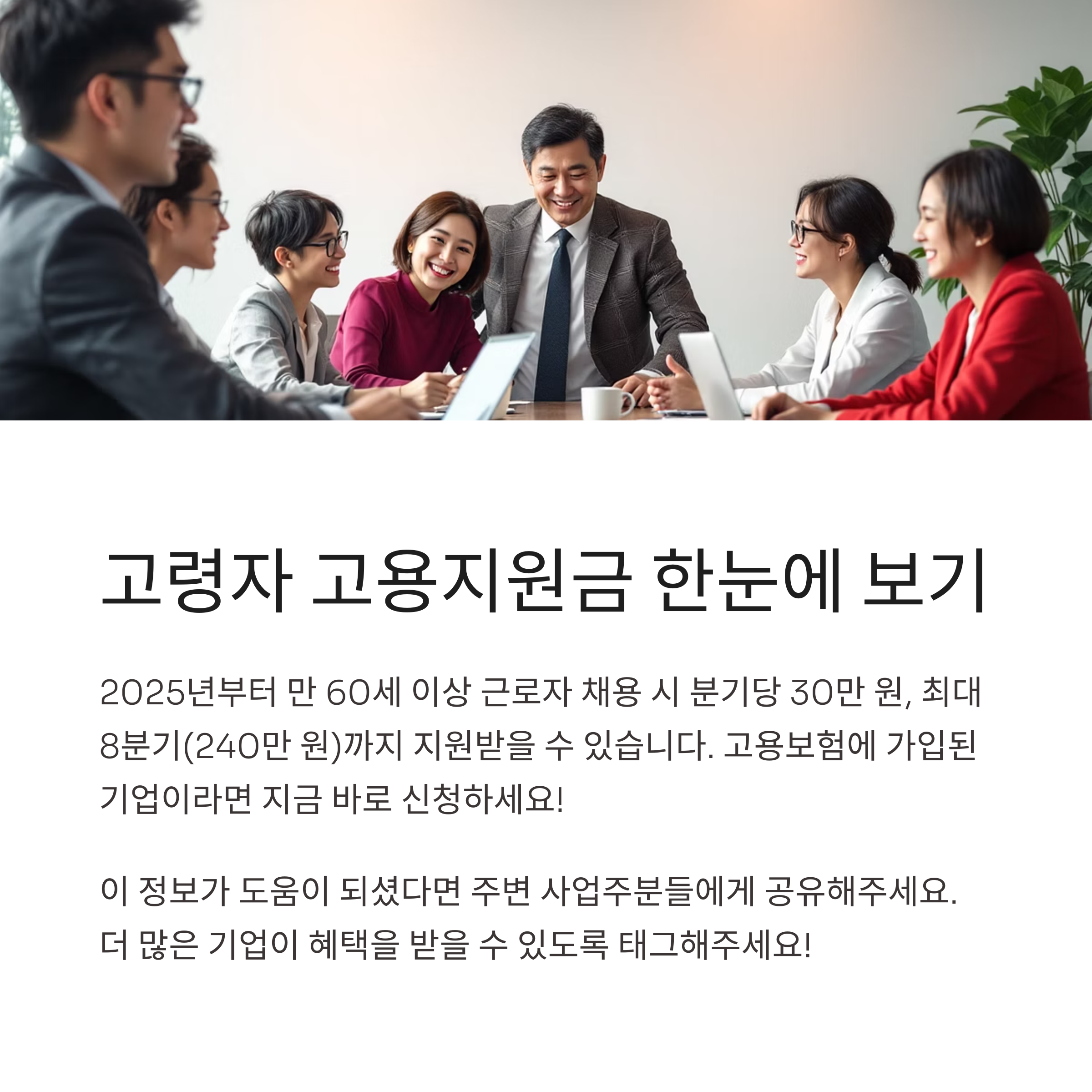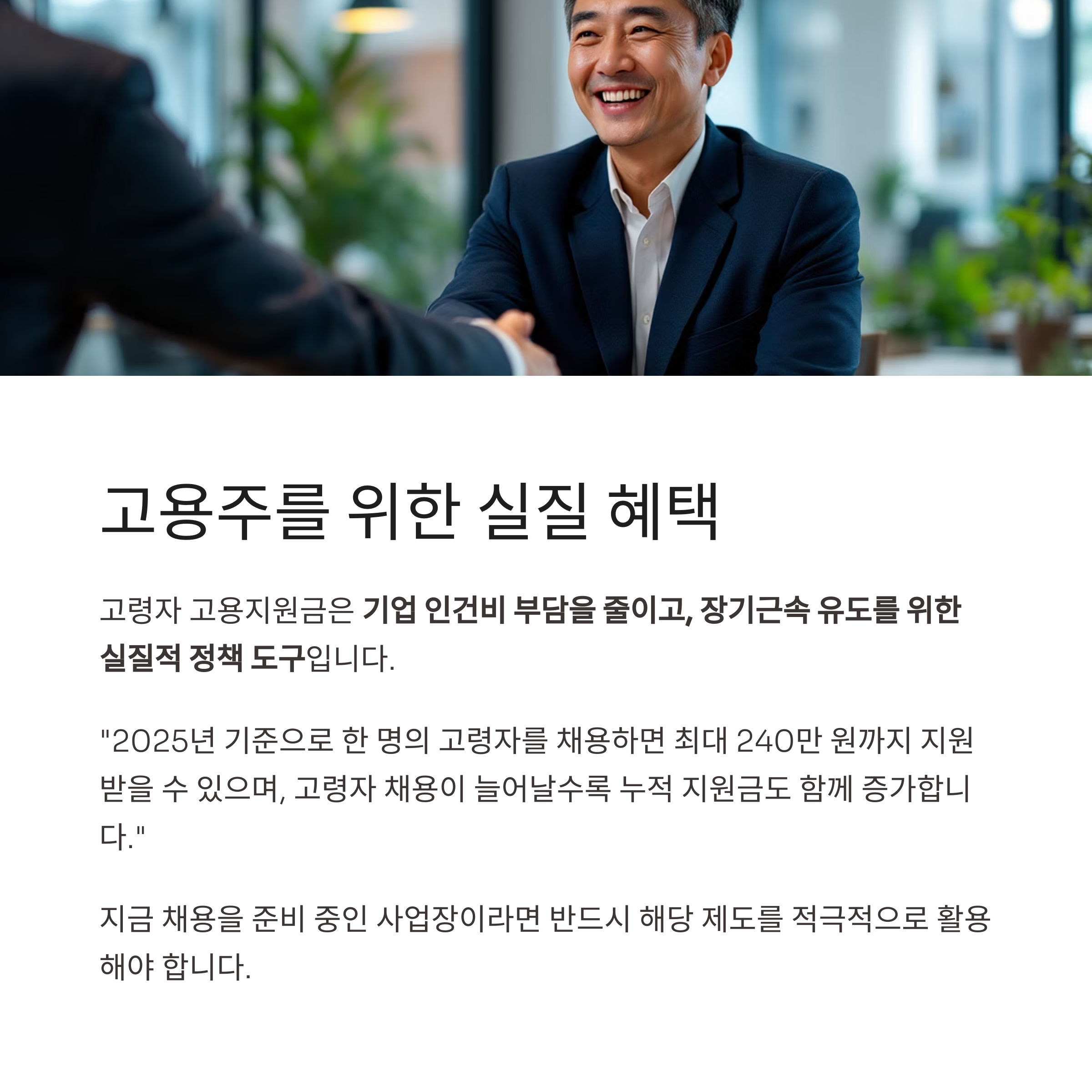 "2025년 기준으로 한 명의 고령자를 채용하면 최대 240만 원까지 지원받을 수 있으며, 고령자 채용이 늘어날수록 누적 지원금도 함께 증가합니다."