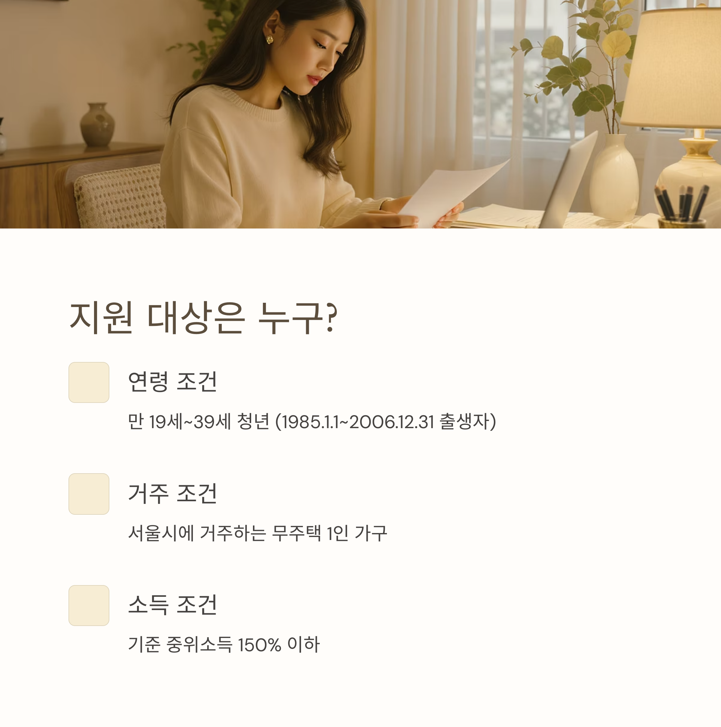 서울시에 거주하는 만 19세 이상 39세 이하 청년이라면 누구나 신청 가능합니다.